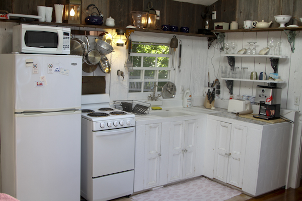 For sleeping, there is a very private room that holds a custom made kingsize bed facing windows on the garden and the bay. This room has a fireplace, a dresser and a closet to hang clothes. A smaller room located at the opposite end of the cottage has an antique double pineapple bed with a bay view. There is a small bathroom with a clawfoot tub and shower. The front of the beach cottage has a private deck on the bay with reclining deck chairs.