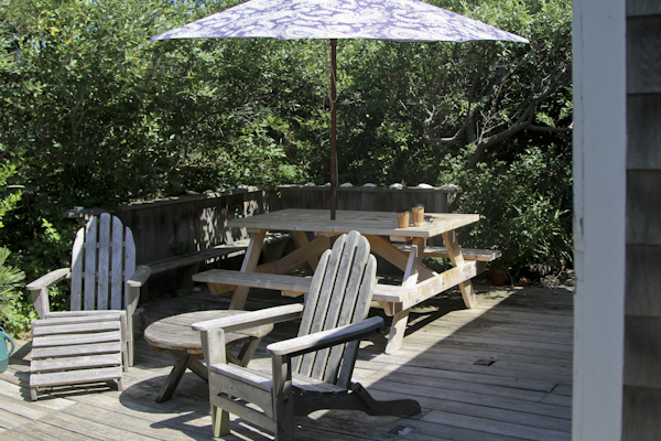 The Shack is surrounded by pines with a great outdoor shower facing the bay. It is located back about 35 feet from the dune. There is a seating area at the very top of the dune in front of the cottage. There is a path to the stairs to the beach seconds from your door.